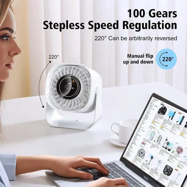 [UPGRADE 100-SPEED ADJUSTMENT]:Newly upgraded 1-100 infinitely adjustable speeds to adjust the table fan according to you can customize airflow.220° manually adjust the rotation angle to send air. Can be placed on the desktop or hung , compact and portable, easy to use.