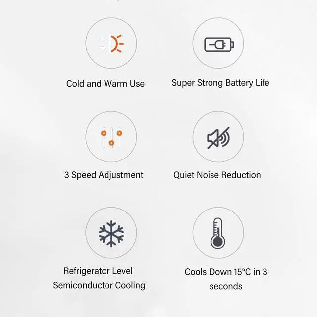 [ADVANCED COOLING & HEATING TECHNOLOGY] This innovative neck fan utilizes cutting- semiconductor technology to provide both cooling and heating functions. With 3 adjustable cooling settings (15°C 20°C 25°C) and 3 heating levels (35°C 45°C 55°C) it ensures year-round comfort regardless of the season. The precise temperature control allows you to customize your experience for optimal comfort during any outdoor or indoor activity.