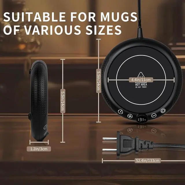 2-12H Custom Timer & Auto Safety Shut-OffSet it and forget it! Our mug warmer defaults to a safe 4-hour auto shutdown. Customize the timer from 1 to 12 hours for all-day safety. Perfect for the office or home, it prevents energy waste and gives you total peace of mind.