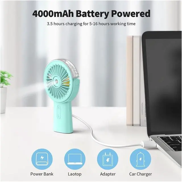 [Long Battery Life & Power Bank Our portable mist fan is powered by a 4000mAh rechargeable battery which can run for more than 615 hours depending on the wind speed Are you still annoyed or embarrassed that your phone is out of battery? This Fan can be used as a handy emergency power supply.