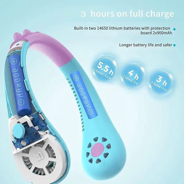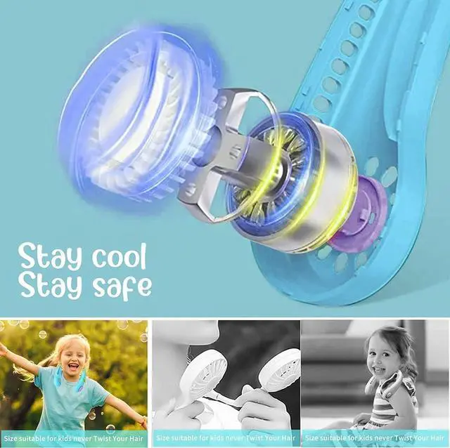 Safe and Soft Silicone MaterialThe leafless neck fan for kids can adjust the angle freely, easy to put on, light weight, like ears on the neck. Bladeless design and hidden turbine design make it more secure. No need to worry about the hair getting caught on the wings when using the fan. 3-6 second operation, 3 speed
