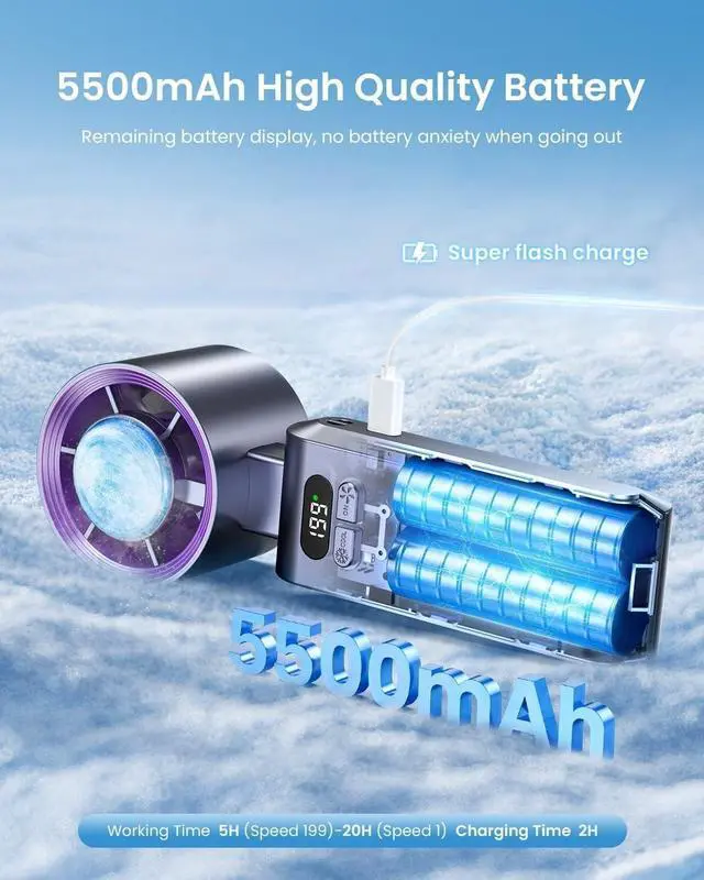 20H Max Cooling Time: Our handheld turbo fan is equipped with a powerful 5500mAh rechargeable battery, offering up to 20 hours of cooling time on a single charge, twice the capacity of a standard handheld fan. Enjoy flexible usage with 5-20 hours of runtime, depending on the speed setting. Recharging is quick and convenient, taking just 2 hours via a regular outlet, power bank, or any USB-compatible device