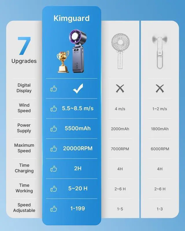 Ultra-Fast Turbo Cooling: Features an advanced 7-blade design paired with a high-speed three-phase brushless motor, delivering a maximum wind speed of 8.5m/s 2x faster than traditional hand held fans! With a 20000 rpm maximum speed, it instantly blows away the heat, keeping you cool and comfortable all day long