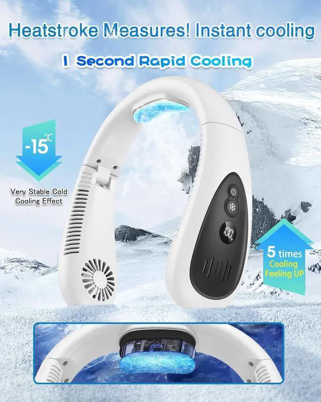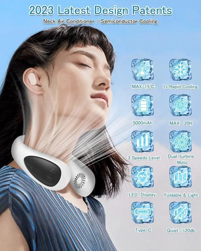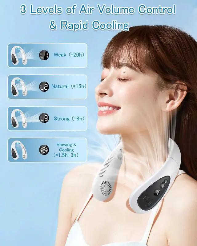 • [Neck Air Conditioner & Semiconductor Cooling] A must-have neck fan for hot weather. Cooling plate and fan dual construction reduces body temperature up to 14 degrees Celsius The wind from the fan and the cooling plate hits your neck, giving you a cooling feeling as if you are wearing the cooler on your skin, and you will be comfortable even in the hot. 1S Rapid Cooling & 3 Level Air Flow Adjustment: You can freely move around your neck, shoulders, and neck