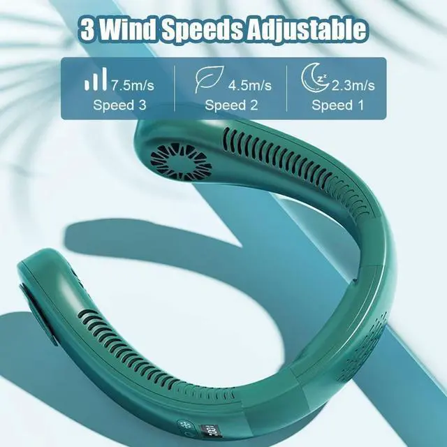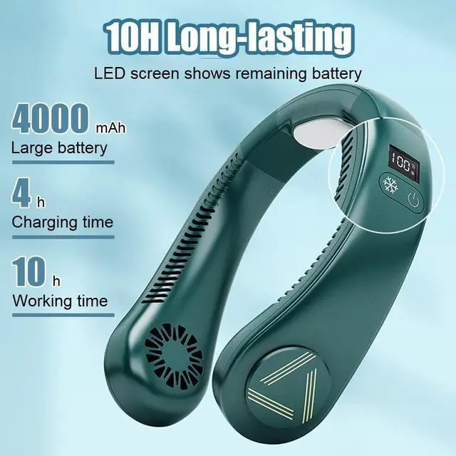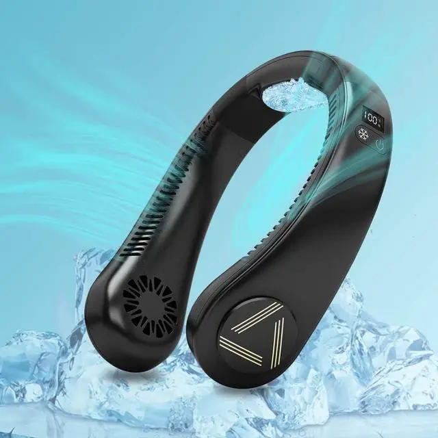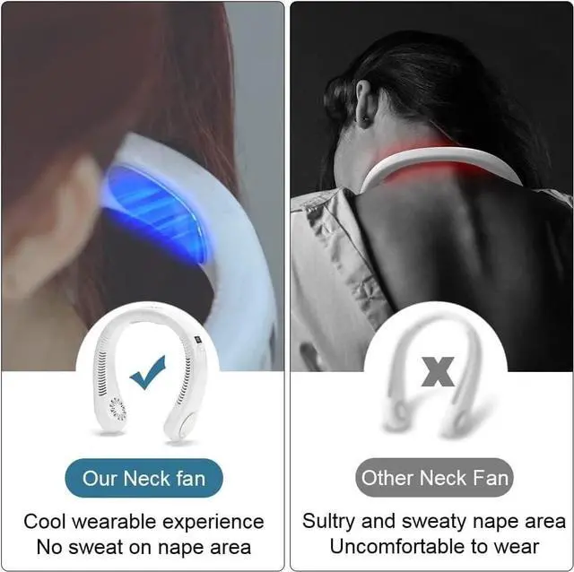 New AC Cooling Fan: The built-in semiconductor cooling chip gives your skin a cool feeling in 3 seconds. No need to worry about sweat around your neck and keep it up to 50 to 68 degrees below ambient temperature. Bladeless & PowerfulPowerful motor produces powerful air flow, 32 air vents deliver cool air in all directions. 3 adjustable wind speed. Bladeless design prevents clothes from tangling