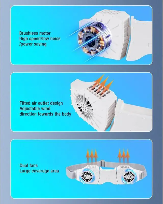 [Wide Coverage]: Designed to conform to various body contours, this fan cools multiple body areas, making it suitable for diverse users and outdoor or indoor tasks.