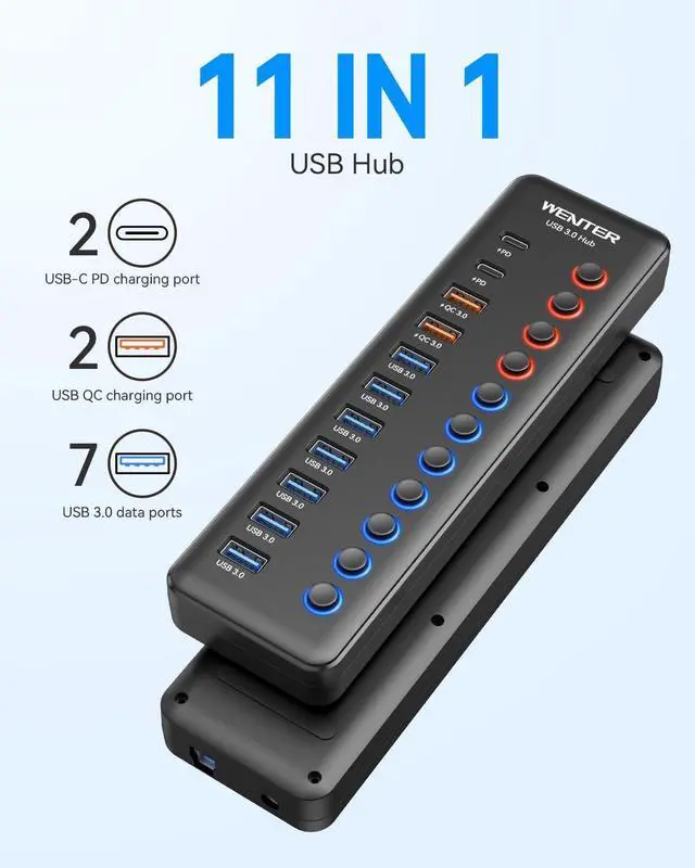 USB Power Hub with QC Charging Port: Wenter Powered USB hub offers additional 2pcs A Port and 2pcs type-C charging dedicated port, so you can charge your tablets, cameras, phones, watch, and Bluetooth Headset without having to find extra wall outlet space. With the 12V/ 4A power adapter, The USB hub can support PD3.0 and QC3.0. NOTE: Charging Port do not support data transfer!