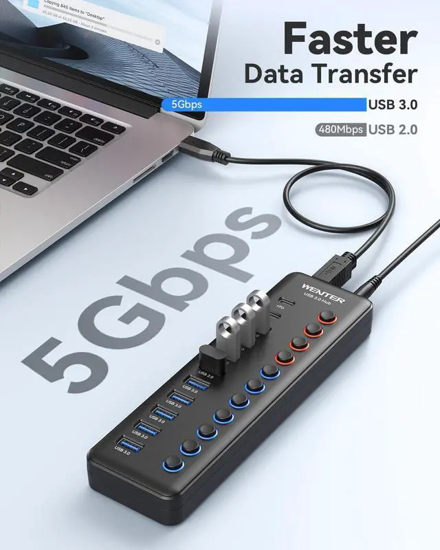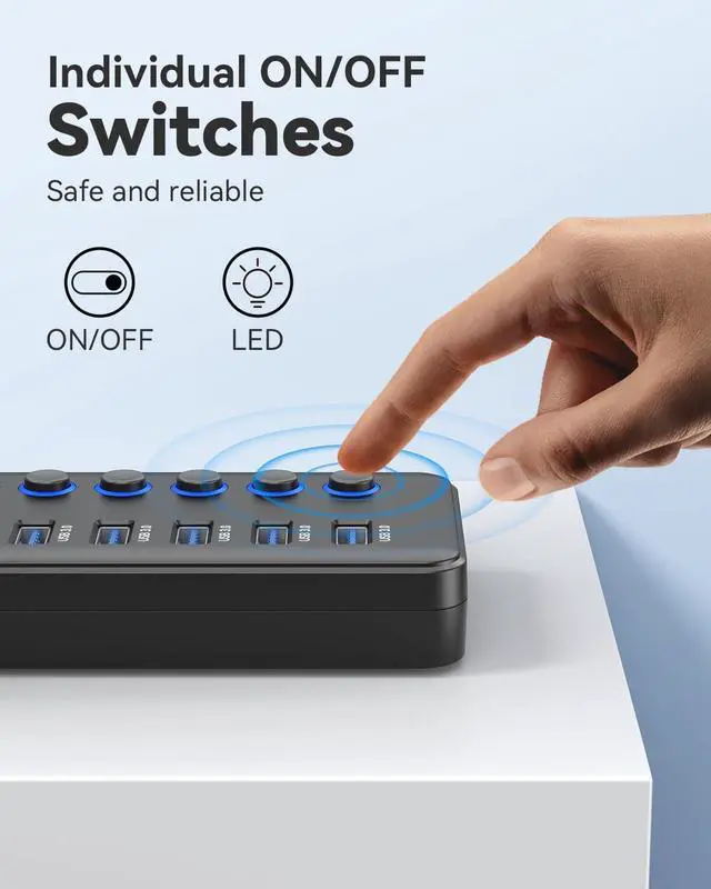 Individual On/Off Switches: USB hub powered is designed with individual on/off switches, you can turn the power on and off whenever you choose without unplugging the equipment. Besides, Each port includes an LED light (Soft light -Not harsh to the eyes) so you can check the power status.