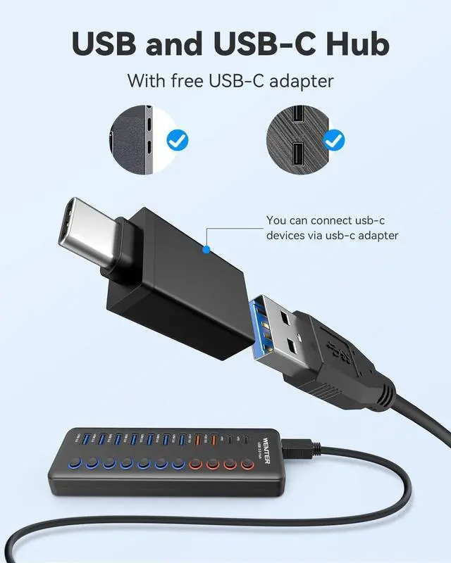 Additional Usb C Adapter is includedProviding a free usb C adapter extends its applicability. You can use it on more applications, no matter it is A port or C port . The USB and USB C hub comes with a 100cm(3.3ft) USB cable and 120cm(4ft) power cable, enough length to let you arrange your cables anywhere. What You Get: 1 * Powered USB Hub, 1* 12V/ 4A DC Power Adapter, 1 * USB C adapter, 1 * USB Cable, 1 * User manual. 24-month warranty, 24h friendly customer service and email support.
