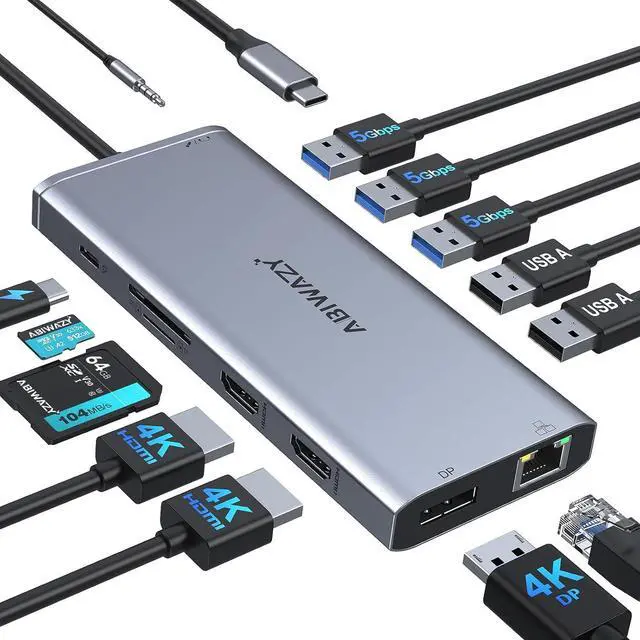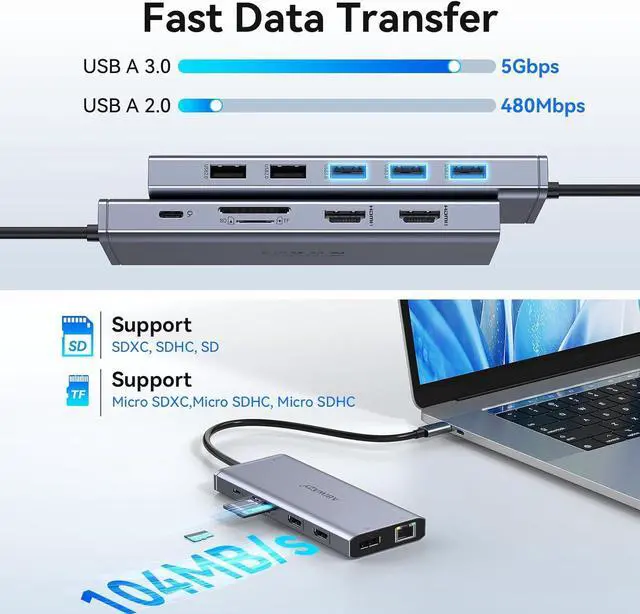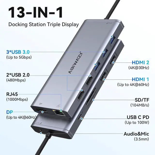 • 13 in 1 USB-C Docking Station: The laptop docking station easily convert your laptops USB-C Port into 13 Ports: HDMI 1 (4K@60Hz), HDMI 2 (4K@30Hz),Display Port(4K@60Hz),100W USB C Power Delivery port,Gigabit Ethernet(1Gbps) ,3 USB 3.0, 2 USB 2.0,SD/Micro SD card readers,3.5mm Mic/audio port. Please Note: It only supports mirror mode without multiple displays if you use it to connect MacBook