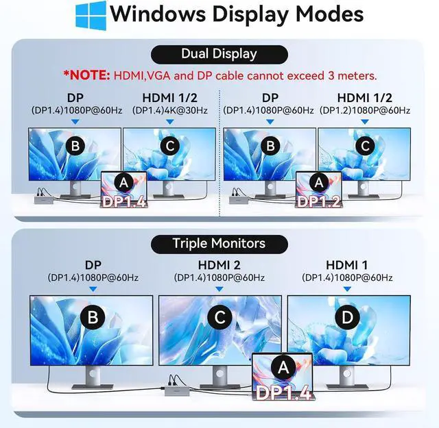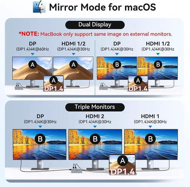 Triple Display Docking Station for Laptop Dual Monitor 4K Display Adapter: The usb c hdmi hub laptop docking station for multiple monitors adapter. While single use HDMI 1 port or displayport resolution up to 4K@60Hz, single use HDMI2 resolution up to 4K@30Hz. Dual monitors will be 4K@30Hz and 1080P@60Hz(DP1.4). Triple monitors will be 1080P(DP1.4). Please make sure that the USB-C port on your laptop supports video transmission