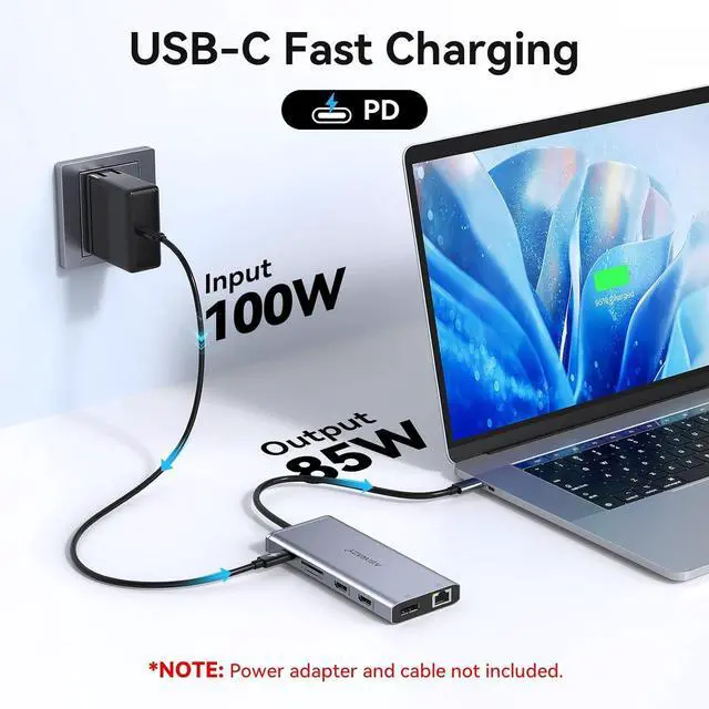 High Power Delivery and Gigabit Ethernet and PD 3.0 Port: This docking is not only designed with a PD 3.0 port for connecting extra power supply which supports charging your laptop(Powered up to 85W)(Note: There is not equipped with an additional charging cable), but also designed with a Gigabit Ethernet port presenting you a stable and fast Ethernet condition, you can enjoy the ultra fast gigabit ethernet speeds up to 1000Mbps