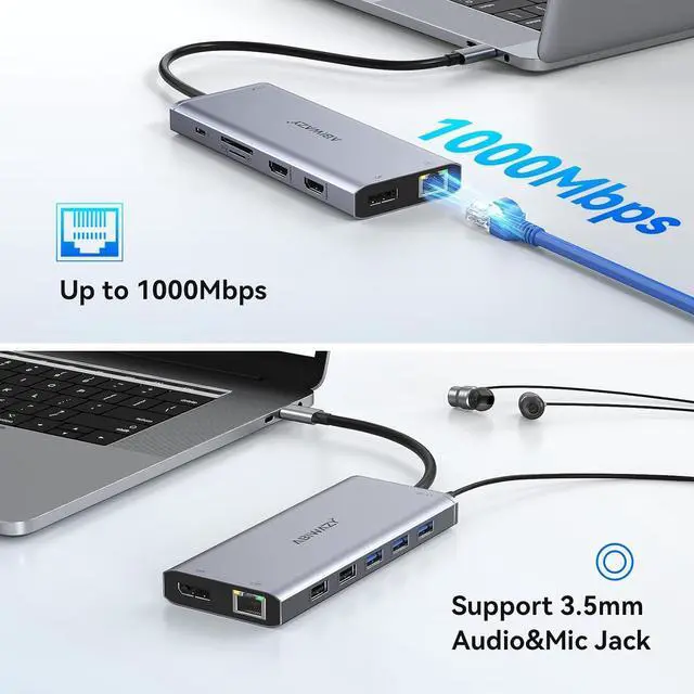 13 in 1 USB-C Docking Station: The laptop docking station easily convert your laptops USB-C Port into 13 Ports: HDMI 1 (4K@60Hz), HDMI 2 (4K@30Hz),Display Port(4K@60Hz),100W USB C Power Delivery port,Gigabit Ethernet(1Gbps) ,3 USB 3.0, 2 USB 2.0,SD/Micro SD card readers,3.5mm Mic/audio port. Please Note: It only supports mirror mode without multiple displays if you use it to connect MacBook