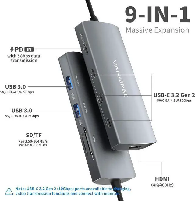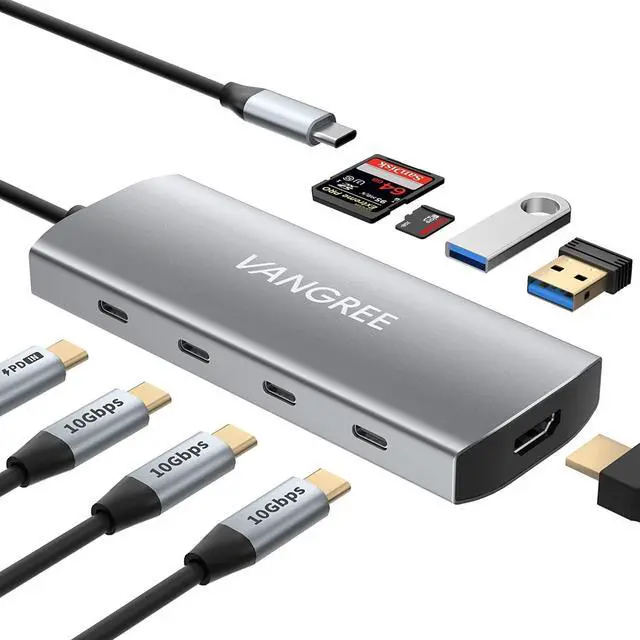 9 IN 1 MULTIPORT USB C HUB: This USB C multiport adapter expands one type-c port to 3*USB C 3.2 Gen 2 ports, 2*USB 3.0 ports, 100W Power Delivery port, 4K@60Hz HDMI port, SD/TF card slot, providing an easy and quick transfer or backup to your data. Thunderbolt 3/4 Compatible.