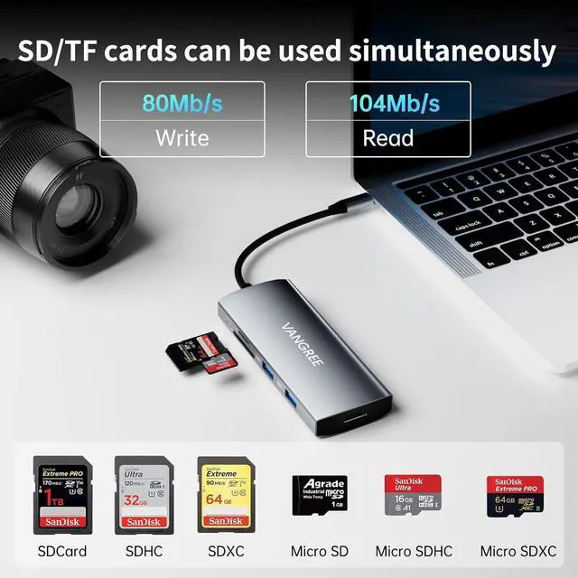 Read SD TF Cards Simultaneously: Built-in SD and TF slots allow users to easily access files from a universal SD card and Micro SD card. Speed of read: 50-104MB/s and write: 30-80MB/s. These speeds allow for quickly transferring large files, increasing users' productivity.