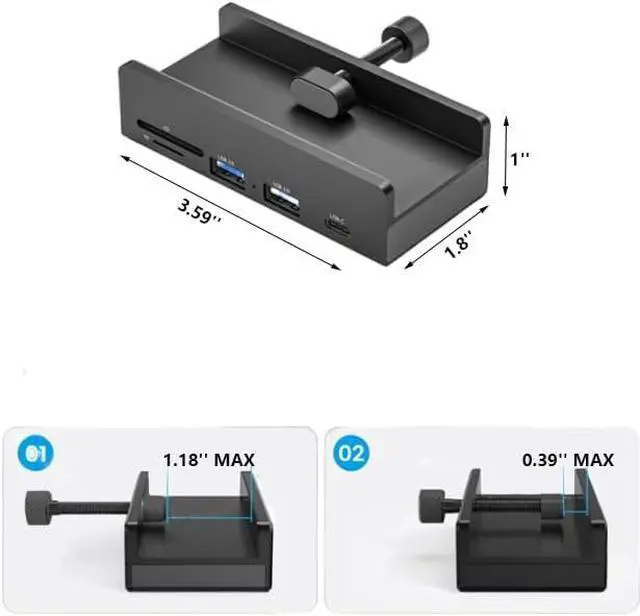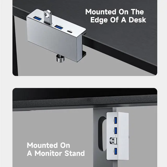 For 2023 iMac Aluminum Clampable Hub Design:mountable usb hub designed with adjustable screw allow you to mount monitor screen edge or desk edge thickness from 0.39 to 1.18 inches (10-30mm), It can be firmly fixed on the edge of the desktop or monitor for a semi-permanent mount, and will not shake or move when plugged in or out.The parts in contact with the desktop or monitor are covered with soft silicone pads to avoid scratches.