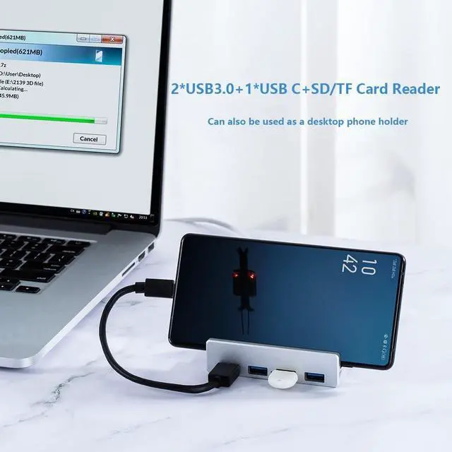 6 IN 1 USB Cable: The multiport USB C hub includes an extra USB C to USB Cable, combination of USB-A and USB-C port is designed to allow one device to compatible with a variety of iMac, ps4 pro, Dell, Asus and other desktop computers and computer tables.It can also be used as a normal desktop cell phone holder for more convenient office work.