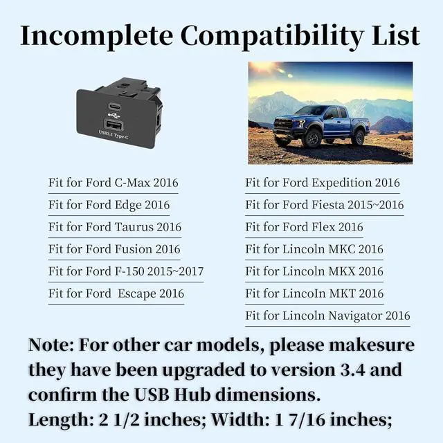 Compatible Models - Carplay USB interface hub,SYNC 3.4 USB -C for Ford C-Max 2016, Ford Edge 2016, Ford Taurus 2016, Ford Fusion 2016, Ford Escape 2016, Ford Expedition 2016, Ford F-150 2015-2017, Ford Fiesta 2016, Ford Flex 2016, Lincoln MKC MKX MKT Navigator 2016, etc.