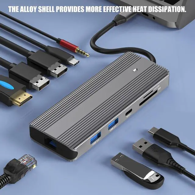 from aluminum and PVC, this USB C Docking Station boasts portable design with plugs and play convenience, eliminating the need for driver while offering RJ45 Gigabit Ethernet, card slots, and auxes 3.5mm music