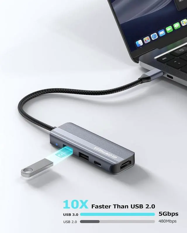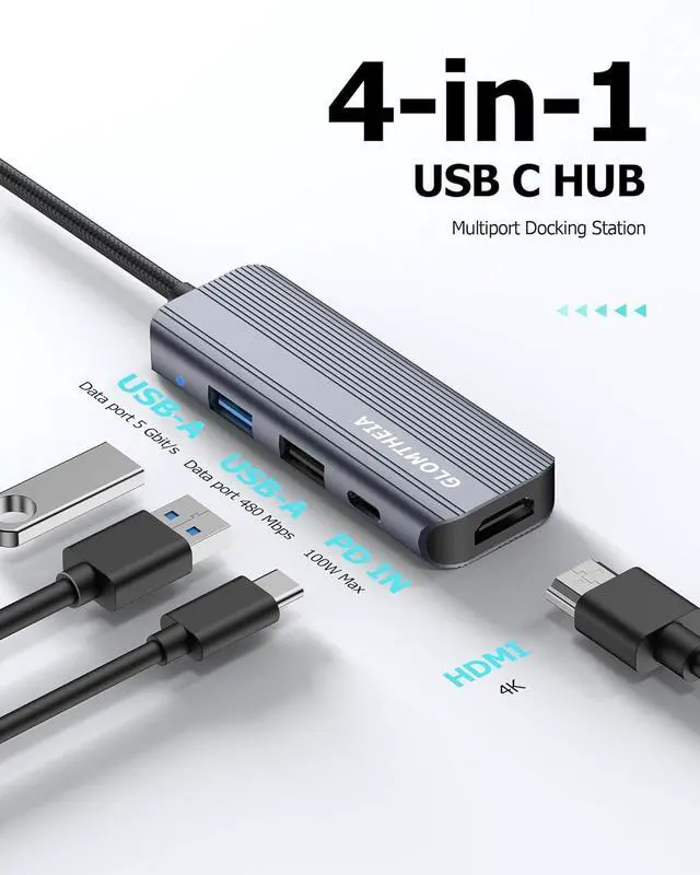 4-in-1 ConnectivityTransform your USB-C port into a versatile powerhouse with our hub. Equipped with a 4K HDMI port, USB 3.0 port, USB 2.0 port, and 100W PD charging, its perfect for boosting productivity and connectivity. Say goodbye to port limitations and hello to endless possibilities.