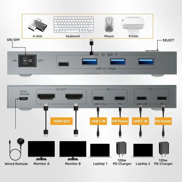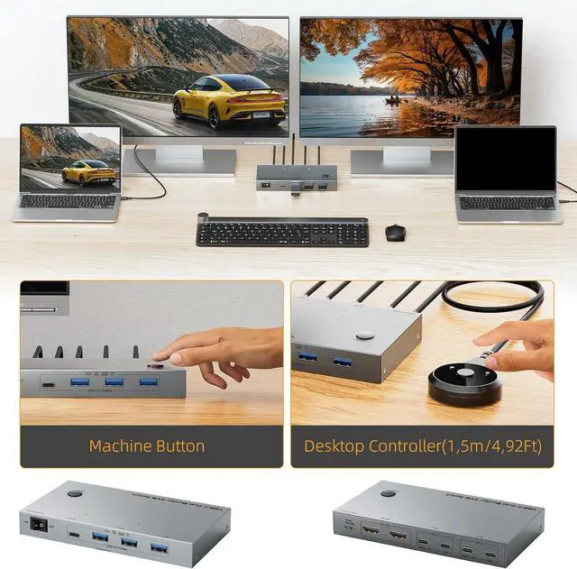 Perfect for home offices or workstations, this switcher eliminates desk clutter by centralizing connection between double monitors, laptops, and USB devices, enabling quick toggling via remote or front panel button
