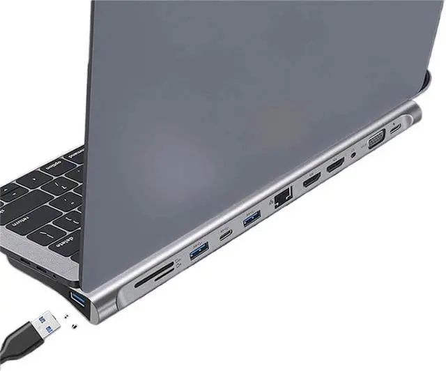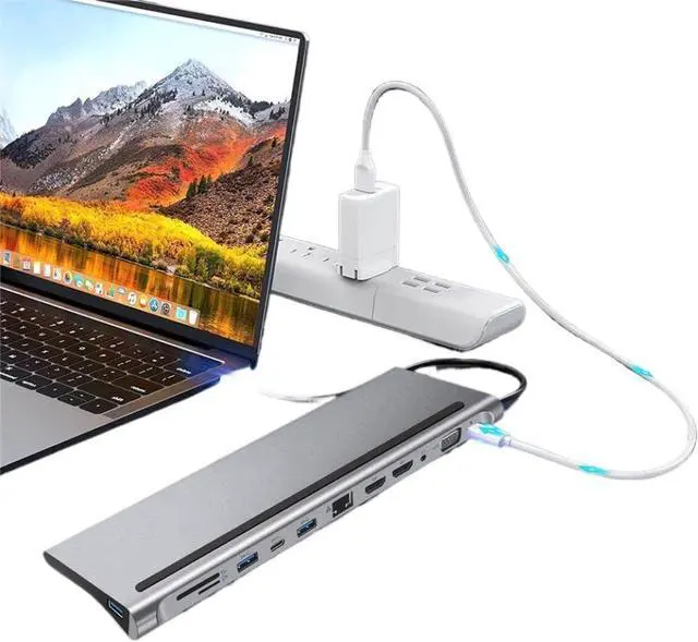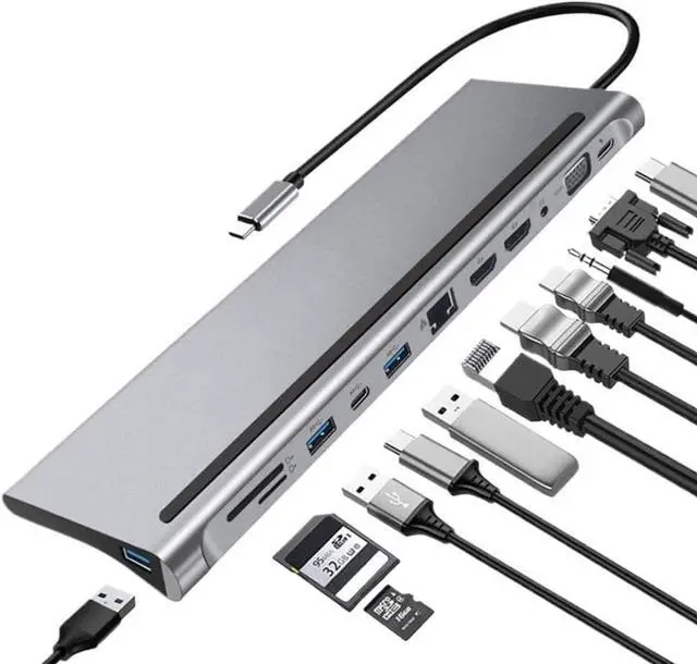 Features 12 in 1 functionality combining HDMI output RJ45 Ethernet port multiple USB 3.0 and USB Type C ports SD and microSD card readers and power delivery support