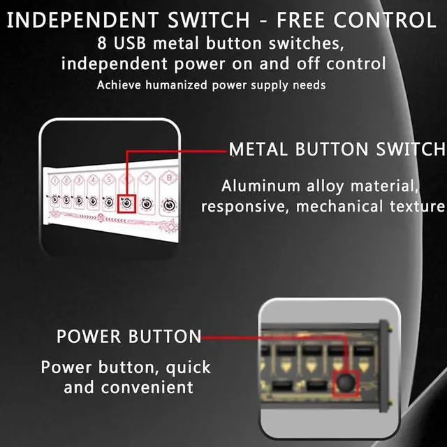 Independent Switch Control: Each USB port features a durable metal toggle switch with a distinct tactile feel. This allows individual power control for each device, eliminating the need to repeatedly plug and unplug cables. This reduces port wear and prevents standby power consumption when devices are idle.