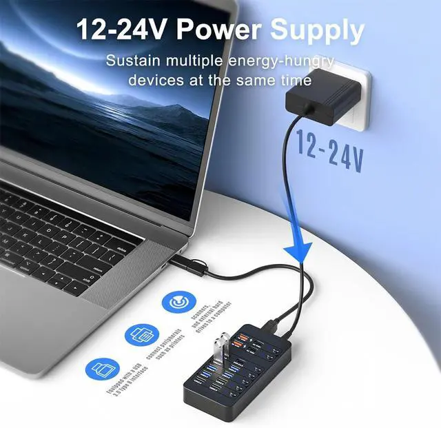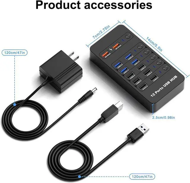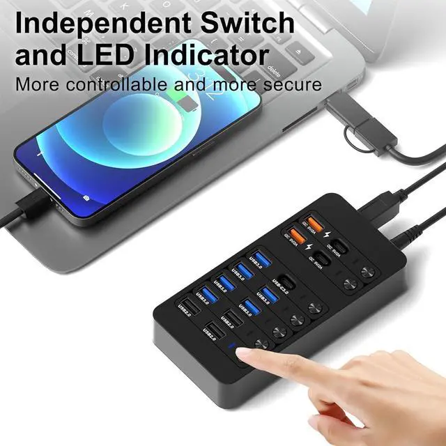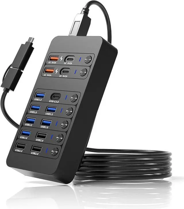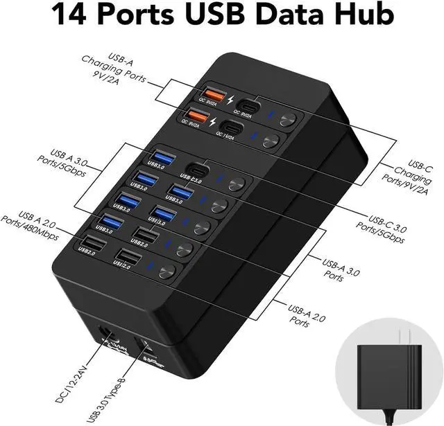 This USB hub supports plug and play and provides 14 ports, including USB A and USB C for integration without additional drivers