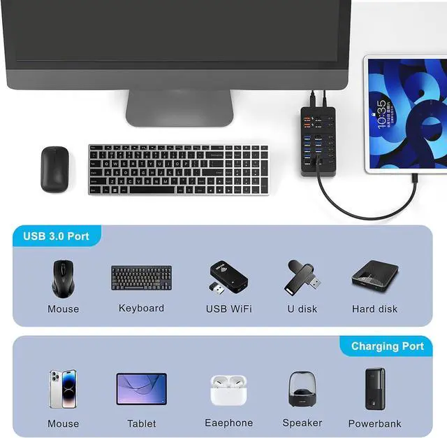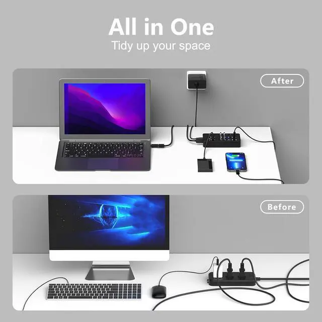 This lightweight and portable 60W USB hub is designed to increase productivity and simplify your digital life while maintaining a sleek, efficient desktop aesthetic
