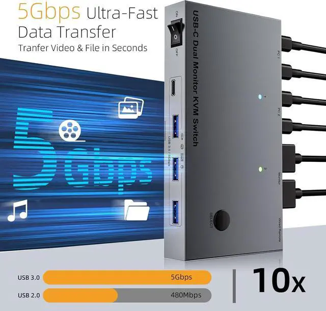 This double monitor KVM switcher display for offer fast 5Gbps data transfer through 4 USB3.0 port, including dedicated charging port for laptop power