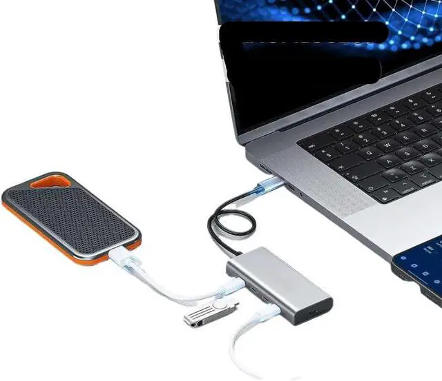 Features multiple ports including USB-A and USB-C for connecting peripherals such as external drives, mice, keyboards, and smartphones