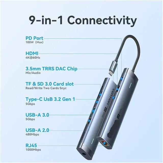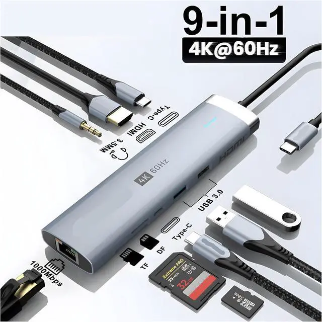 USB C Hub HDMI 4K 60Hz 9 in 1 PD 100W Adapter USB 3.2 3.0 Hub 5Gbps Splitter Docking Station Compatible for Macbook Air iPad Laptop.