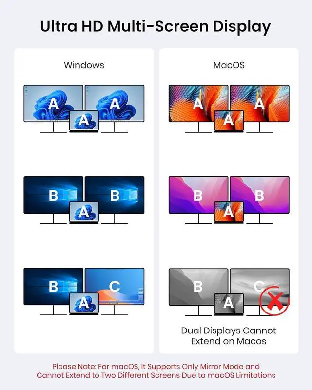 What's Included and Warranty: Receive one 2 HDMI adapter for dual monitors featuring docking station dual monitor HDMI capabilities, with a 24-month hassle-free return policy and round-the-clock support. Supports various display modes on Windows; macOS limited to mirroring.