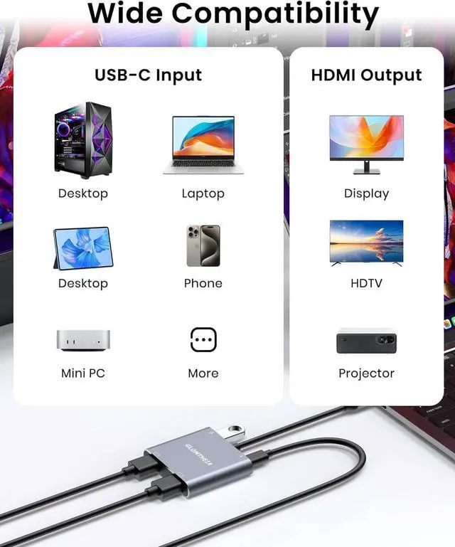 Broad Device Compatibility: The HDMI dual monitor adapter works seamlessly with USB-C equipped laptops and devices across brands (exclusions include certain HP ProBook and Pavilion models). Requires Thunderbolt-compatible or full USB-C ports; no drivers needed.