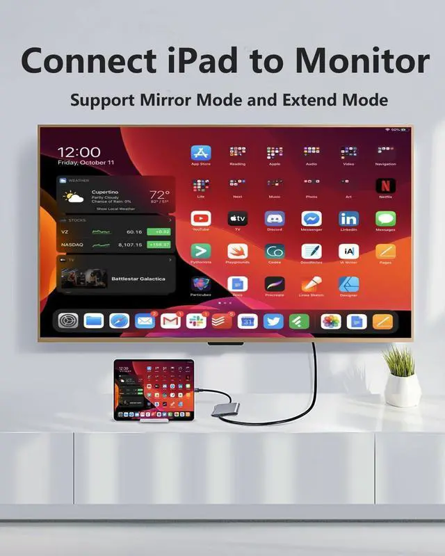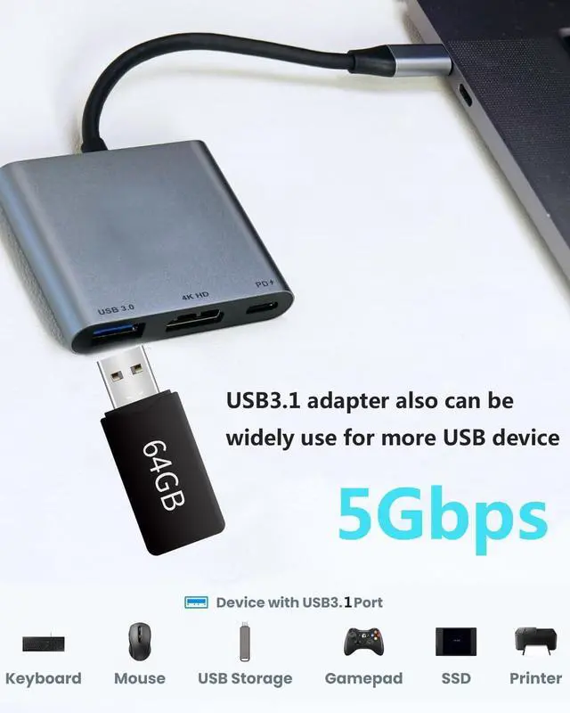 Versatile 3-in-1 USB C HubThe USB C Hub offers a HDMI 4K@60Hz output port, a PD charging port, and a USB 3.1 port. Effortlessly mirror or extend your iPhone or iPad screen to a TV, projector and monitor. Convenient for home-theater entertainment, office work, exhibition, presentation, teaching and more