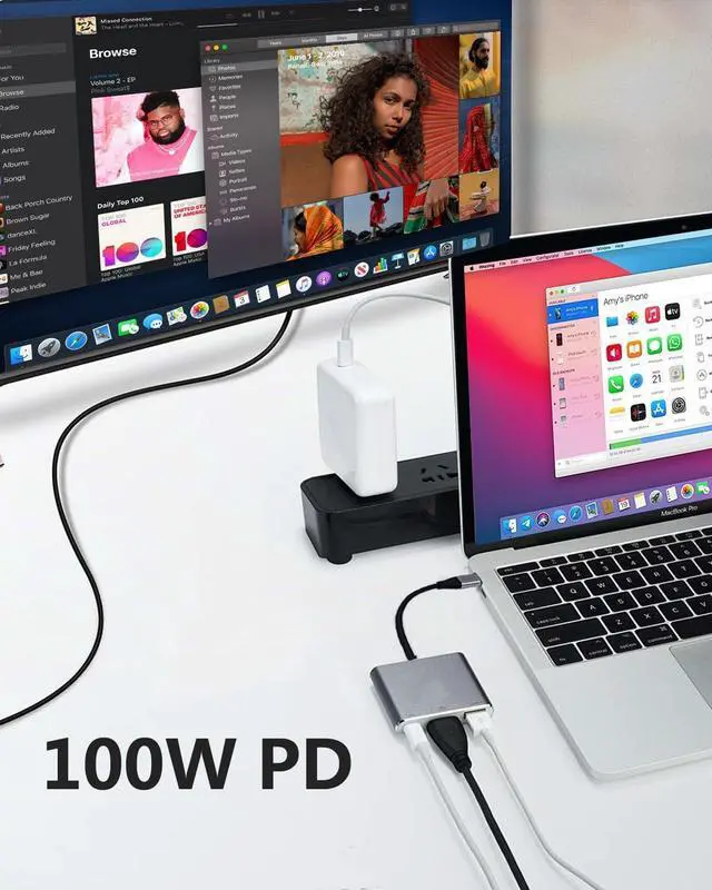 100W PD Fast Charging PortWith dual USB C ports, it solves the problem of no power supply. You can enjoy a bigger view through USB C video input while charging 100W for sustainable use. Plug and Play, No need to install any apps or driver. Warm tips: Actual charging speed may different, depending on the device charging cable, charging adapter, voltage level. And please distinguish two USB C ports for video transmission and charging