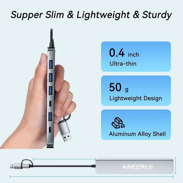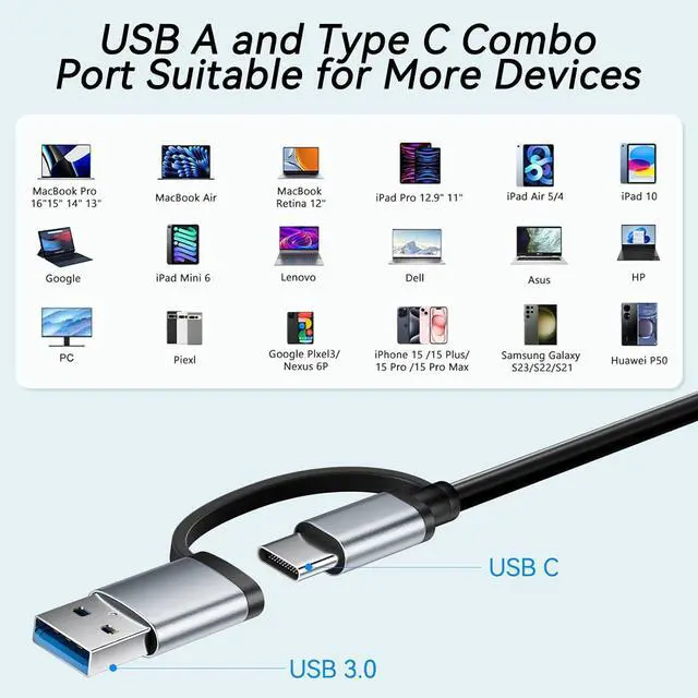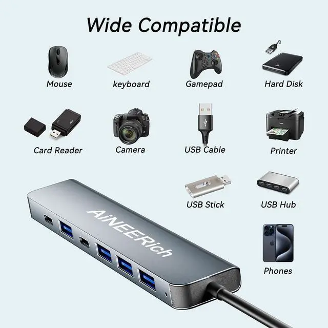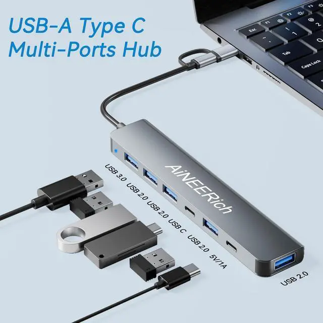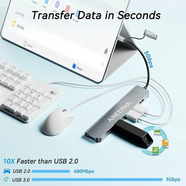 Multi Ports USB Hub: This USB C hub have 1x USB 3.0 port, 4x USB 2.0 ports, 1x USB C port and 1x 5V/1A charging port. One hub meets your needs of charging, transfering and download music, movies, photos and other files. The USB 3.0 supports 5Gbps transfer speed, fast enough to transfer a 10 GB file in just in 20 seconds. The USB 2.0 supports 480bps transfer speed.