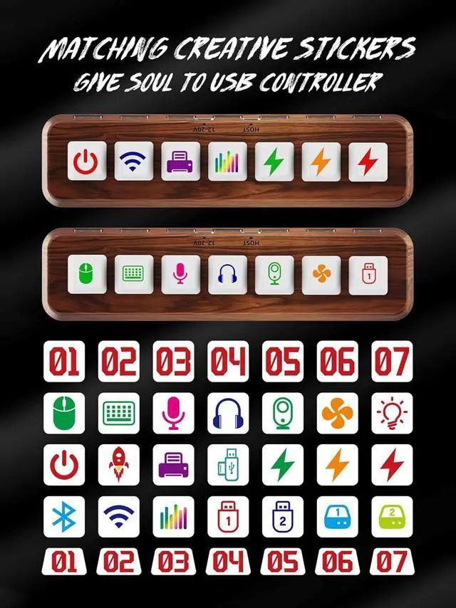 3. Hot swappable control switches: 7 switches independently controlling USB ports support DIY modification, compatible with mechanical keyboards similar Cherry MX Switch and keycaps (gift 35 commonly used peripheral icons to categorize USB ports).