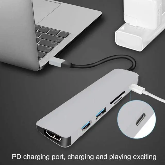 6-IN-1 MULTIFUNCTIONAL HUB: This Type-C 6 in 1 Hub transforms your laptop or phone into a ful workstation, featu , USB3.0 ports, PD charging, and memory card reader for ectivity.