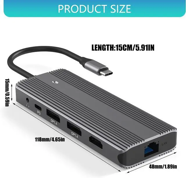 Maximize your connectivity with 11 in 1 USB C Hub, featuring HDTV and DP100W outputs at crisps 4K@60Hz resolution, fast USB3.0 port for 5Gbps data transfer, and 100WPD charging to power devices.