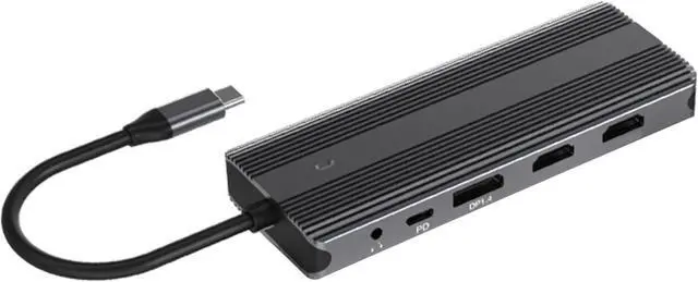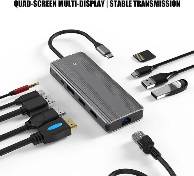 from aluminum and PVC, this USB C Docking Station boasts portable design with plugs and play convenience, eliminating the need for driver while offering RJ45 Gigabit Ethernet, card slots, and auxes 3.5mm music .