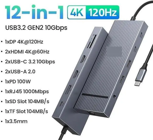 12-in-1 USB HUB Type-C to 2HDMI 4K120Hz DP USB3.2 10Gbps SD/TF RJ45 PD100W for Mac Book Laptop Accessories Docking(12-in-1 2HDMI 1DP)