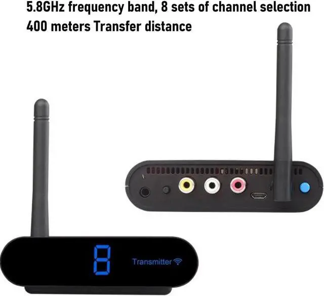 400m Transfer Range: Utilizing the 5.8GHz ISM frequency band, the wireless AV receiver transmitter supports 8 channel selections with a 400 meter unobstructed Transfer distance, ensuring reliable connectivity over longer distances.