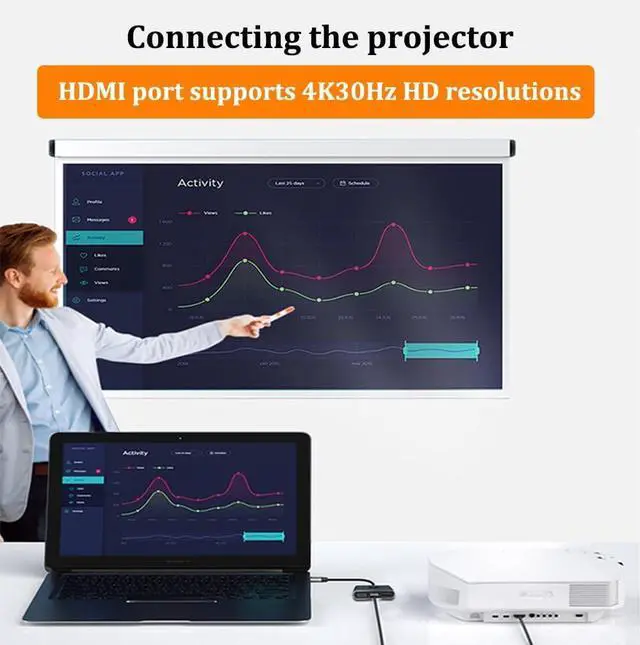 The HDMI port of HDMI to USB C Hub can extend the display of mobile phone/tablet/laptop to projector, TV or other displays. With the highest resolution of 4K (30Hz), Compatible with 2K, 1080P, 720P, etc. To achieve high-definition synchronization. It will provide convenient for your work and entertainment.