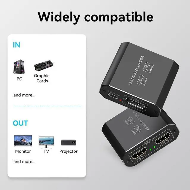 DisplayPort to Dual HDMI SplitterDisplayPort to HDMI extended display splitter is a versatile solution for converting a DisplayPort signal into two HDMI outputs, supporting both extended and mirror modes. Your two HDMI monitors can display different windows instead of having to tab back and forth to view data. Perfect for expanding your workspace or enhancing your gaming experience; Note: Bidirectional transmission is not supported