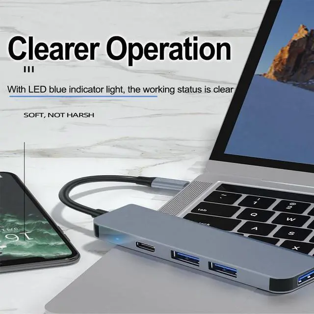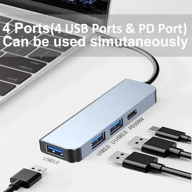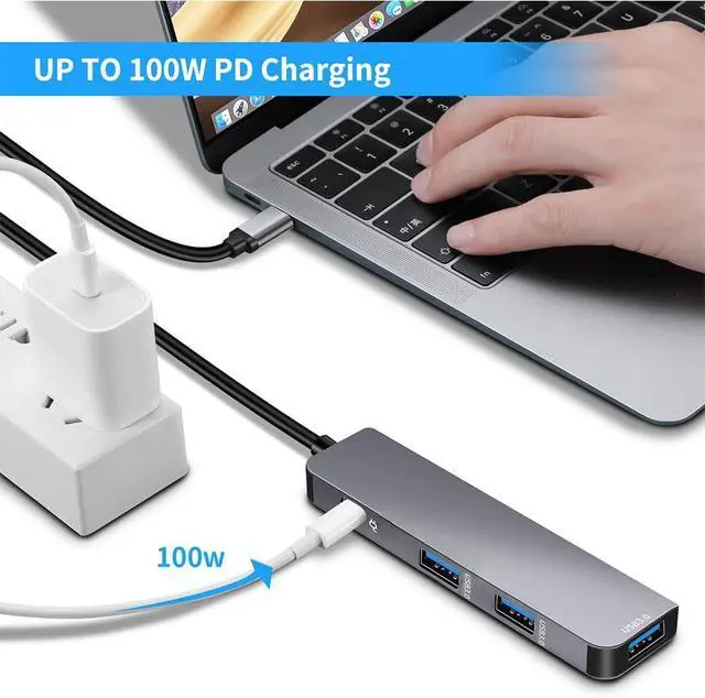 4 in-1 USB C Hub: This usb c hub multiport adapter comes with 1* 100W PD fast charger port so you don't have laptop's power anxiety, 1* usb 3.0 data transfer ports providing up to 5 Gpbs for fast data transmission without waiting. and 2* USB 2.0 support 480 Gpbs data transfer speed, suit for you to connect hard disk, mouse, keyboard, flash drive, hard drives and more for easy work. And the 1 USB-c interface is the perfect solution for your laptop office expansion (Support both data transfer and device charging function).