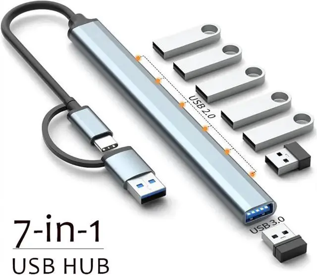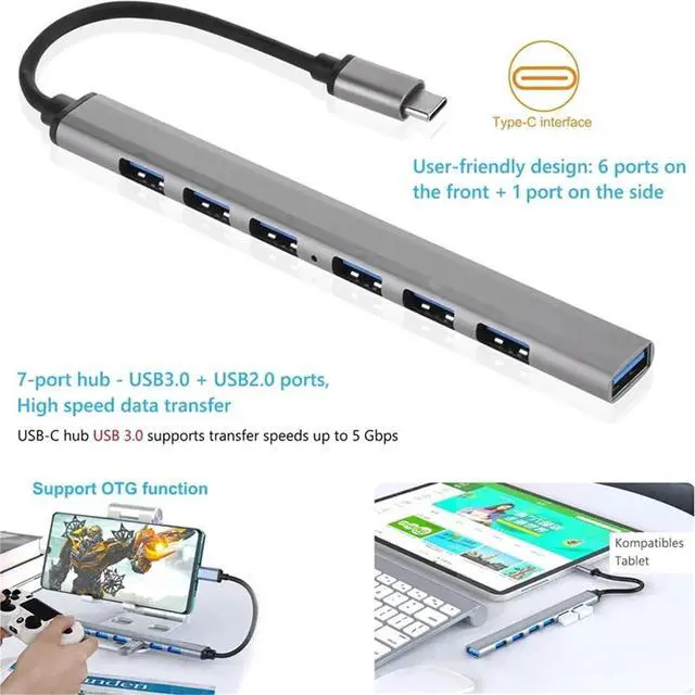USB hub 7-in-1 USB C Hub Adapter - 3.0 & 2.0 Multi-Port Splitter with OTG Support, Aluminum Alloy USB Hub for MacBook, Lenovo, Huawei, Xiaomi Laptops(Type C)