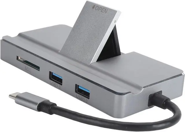 DURABLE AND STYLISH DESIGN: Crafted from high-quality aluminum alloy, this USB C hub is not only durable but also features a sleek and modern design. The built-in stand function supports your phone or tablet, keeping your workspace organized and clutter-.