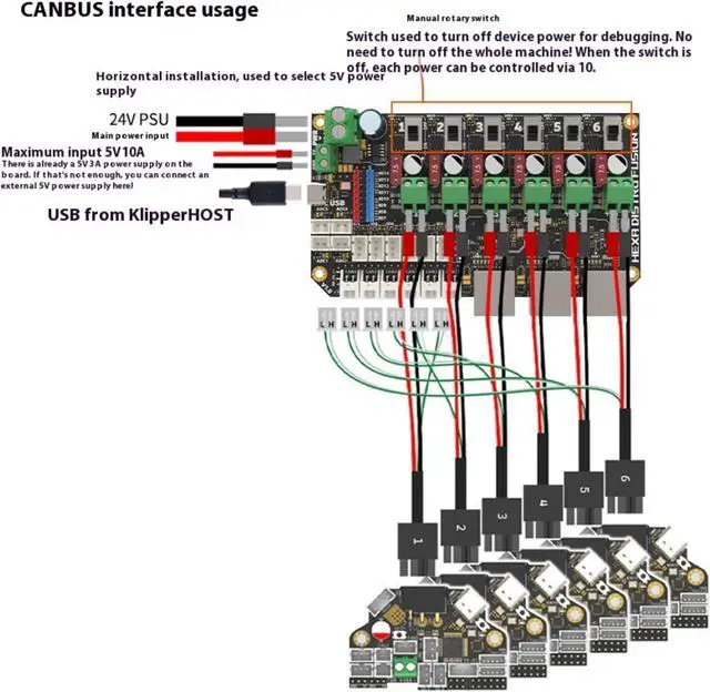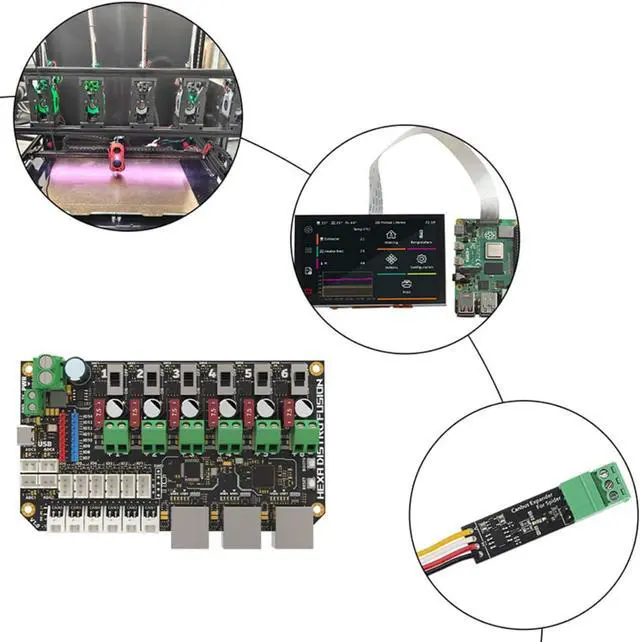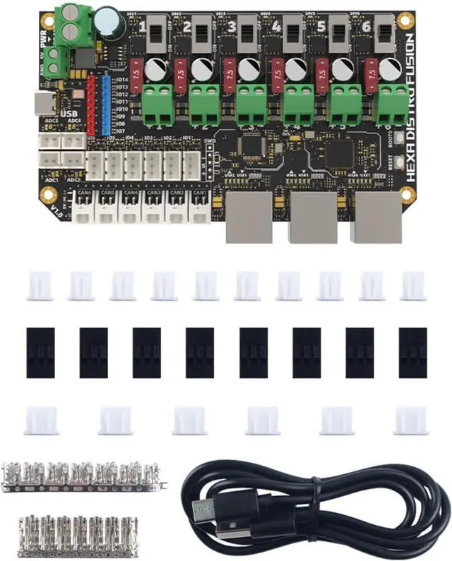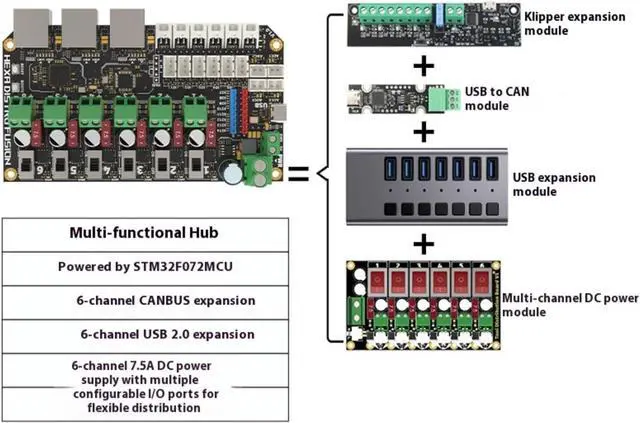 This 6 in 1 /usb 2.0 hub integrates STM32F072MCU for 6-channel communication, USB 2.0 expansion, and 7.5A power distribution for advanced printing setup requiring connectivity and power management