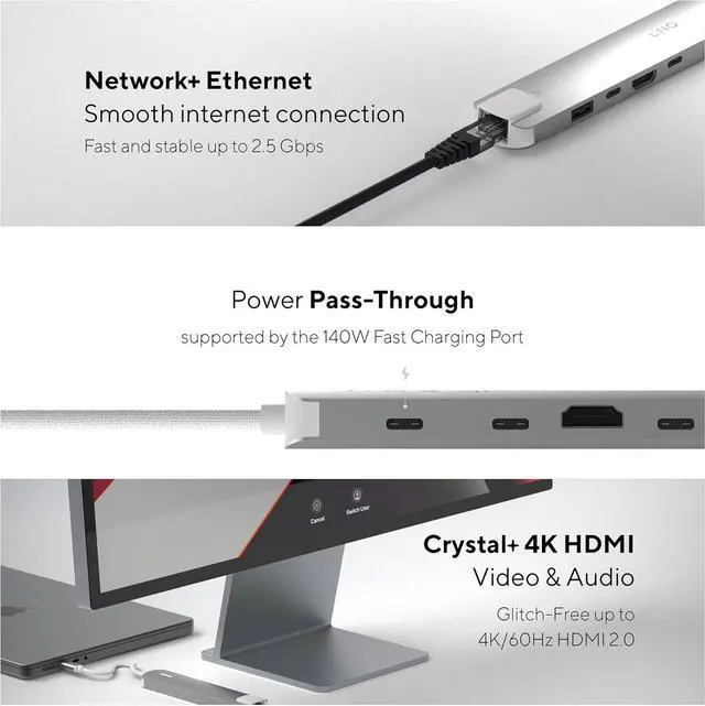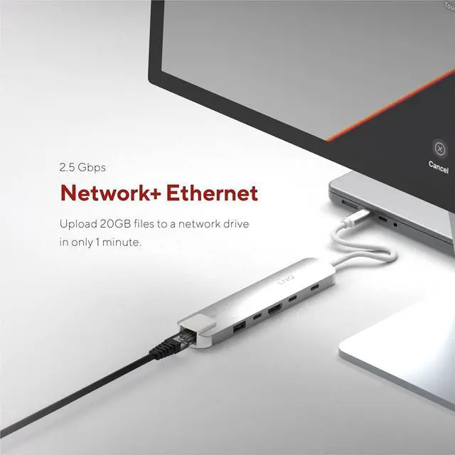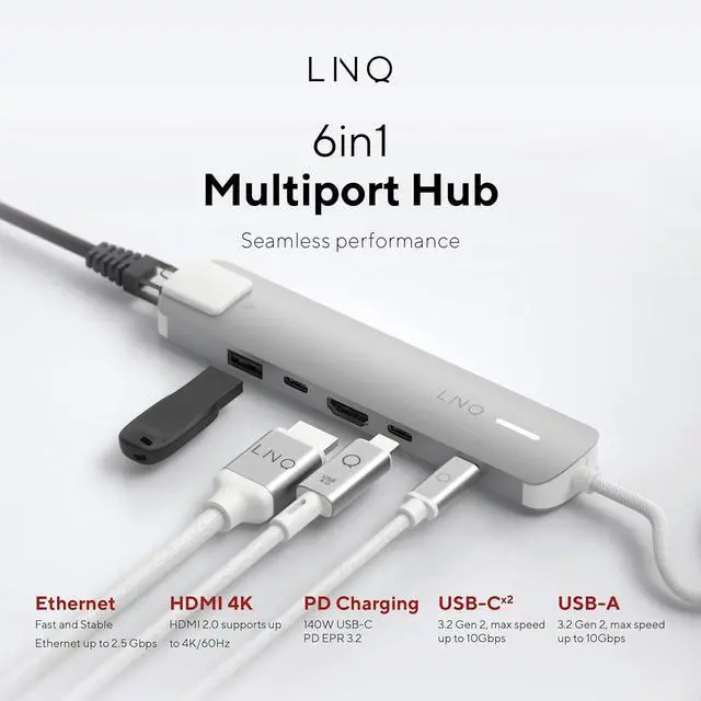 6-in-1 multifunctional connectivity equipped with various ports such as USB-A, USB-C, HDMI, Ethernet and SD/TF card readers, a complete solution for on the go.